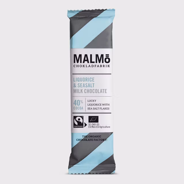 Lakrits & Havssalt från Malmö Chokladfabrik. Mjölkchokladbar med en kakaohalt på 40% smaksatt med lakrits och strösslad med havssalt