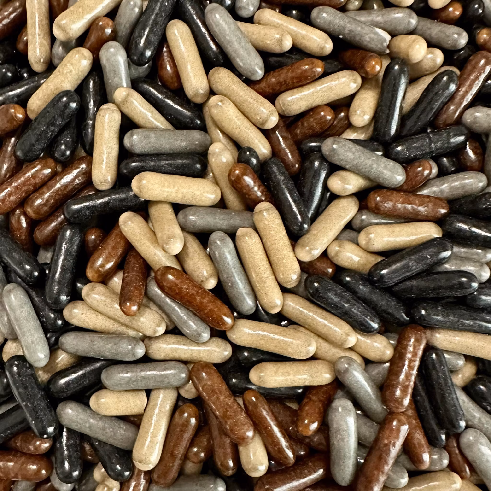 Socker, melass, vetemjöl, glykossirap, lakritsextrakt, salt, färgämne: (E171, E150D, E153), ytbehandling (E904, bivax, karanubavax), vegetabiliskolja, smakämne.